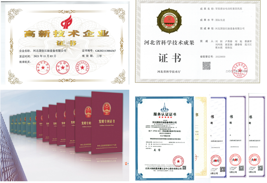 吉林油田公司承包商市場(chǎng)準(zhǔn)入資質(zhì)、中國(guó)石油吐哈油田市場(chǎng)準(zhǔn)入資質(zhì);建立了經(jīng)河北省工信廳認(rèn)定的企業(yè)A級(jí)研發(fā)機(jī)構(gòu);并通過(guò)多項(xiàng)管理體系及售后服務(wù)評(píng)價(jià)體系認(rèn)證,擁有多項(xiàng)國(guó)家專(zhuān)利(詳見(jiàn)企業(yè)簡(jiǎn)介)。